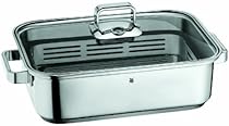 Invite cooking diversity fresh food from the market and fabulous healthy cooking into your kitchen with this WMF Vitalis Stovetop Roaster/Steamer Pan system. This system is an amazing multi-tasker with its abilities for steaming roasting searing or braising. WMF Vitalis features high quality stainless steel that is extremely durable easy to clean and super-hygenic. The Transtherm base and high sides ensure even heat distribution and retention. The built in thermometer in the clear glass lid allows for controlling the inside temperature without removing the lid while the handles are heat resistant. The removable steaming rack serves as an insert for the pan and provides the healthiest cooking system available as the contents cook above the water level allowing the food to retain essential vitmains and minerals. Vegetables remain tender poultry stays succulent and fish does not fall apart or dry out. Also included are one large and one small steamer insert that fit side by side on top of the rack with flexible removable wire handles for lifting the inserts keeping foods separated while cooking. Additional inserts are available as open stock. Unit has a 6-3/4 quart capacity.