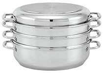 This Beka double oval steamer/roaster set is an amazing addition to your kitchen cookware collection is energy efficient and quite versatile. This set features a high quality stainless steel construction with a layered sandwich base in the base pot and lid for even heat distribution. The base pan is the largest piece and measures 4-3/4 inch tall. This piece may be used for roasting meats and vegetables or as the base pan when stacking the pieces together for steaming. The two center pans are identical and both have steamer holes and measure about 3 inch tall. This allows you to stack different foods in the separate pans and steam them all at one time. The lid is versatile as well in that it can also be flipped over and used as another pan. Also included in this set is a stainless steel roasting rack which can be inserted into the base or the lid. Each piece has dual handles for easy lifting. This roaster/steamer pan is suitable for use on any cooktop including induction and is dishwasher safe. Its generous 15 inch length and 7-1/4 quart capacity make this set a versatile staple for your kitchen.